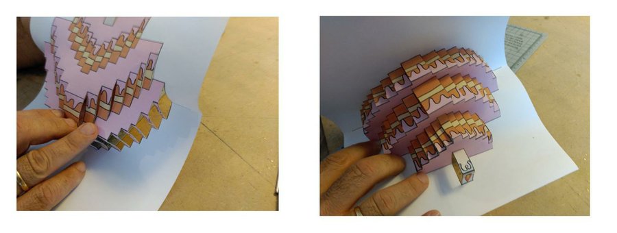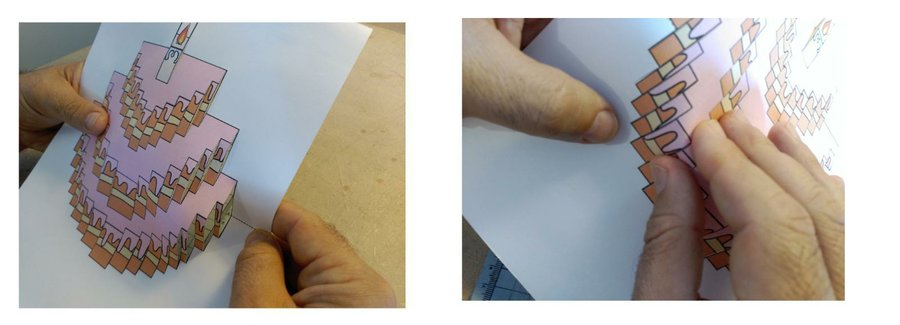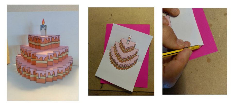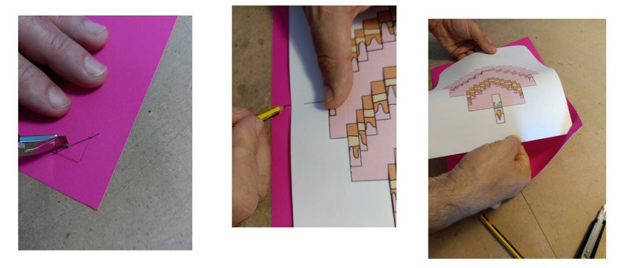 Imprimir la imagen en una cartulina blanca DIN A 4 y recortarla con un cutter. Solo hay que cortar las lineas verticales, la horizontales las dejamos sin tocar.