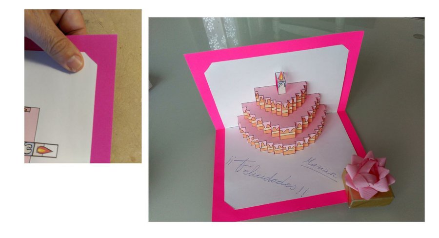 Le damos la vuelta a la cartulina "soporte" e introducimos las esquinas de la carta en las ranuras. Así de esta manera se sujetan las dos cartulinas.