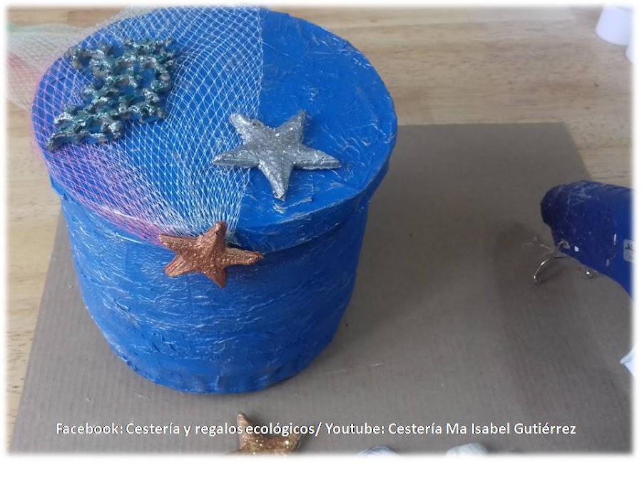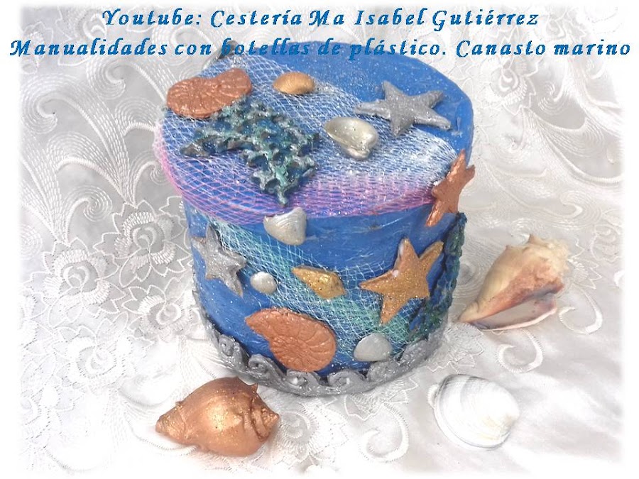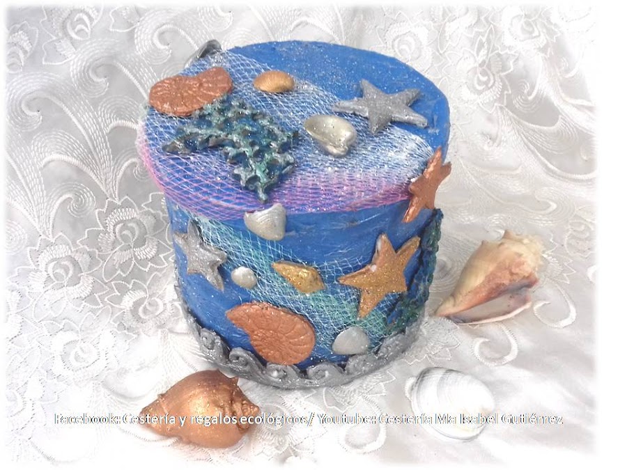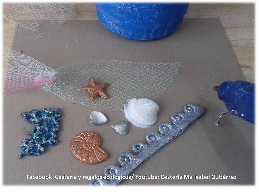 A manera de red podemos utilizar alguna maya de las que traen las frutas, o tela de arpillera o tul. En la tapa pegamos las figuras marinas ya sean naturales o hechas de la masa de cartón...
