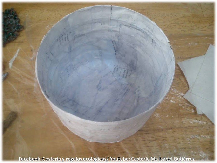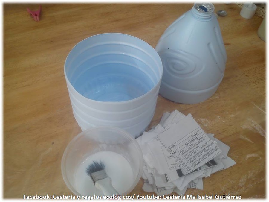 Cortamos la botella o recipiente plástico al tamaño al gusto. Forramos por dentro y por fuera con pedazos pequeños de papel, cortados con nuestras manos, no con tijeras, y una mezcla aguada de pegamento y cola blanca. Podemos utilizar papel de diario o folletos, o como yo lo hice, con hojas blancas de oficina recicladas...