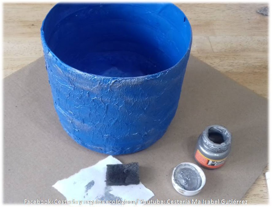 Pintamos en color azul. Podemos utilizar todo tipo de pinturas, recomiendo la pintura vinílica con base de agua porque es económica y rinde bastante. Ya que secó la pintura, aplicamos un poco de brillo aplicando levemente pintura acrílica plateada, con un pedazo pequeño de esponja, midiendo muy poca cantidad, podemos quitar el exceso de pintura de la esponja en algún cartón o papel...