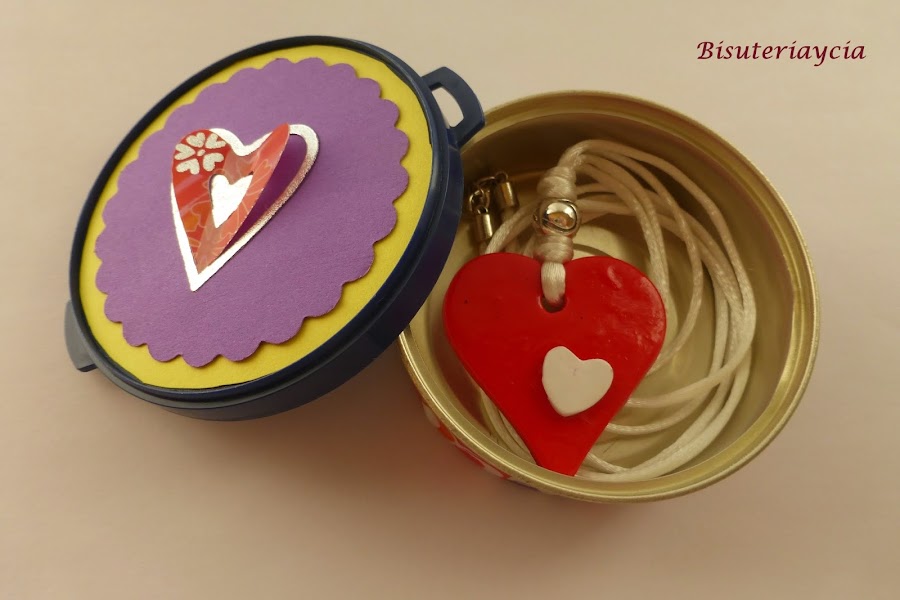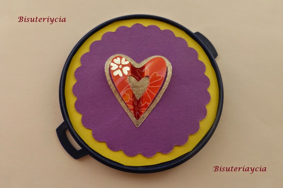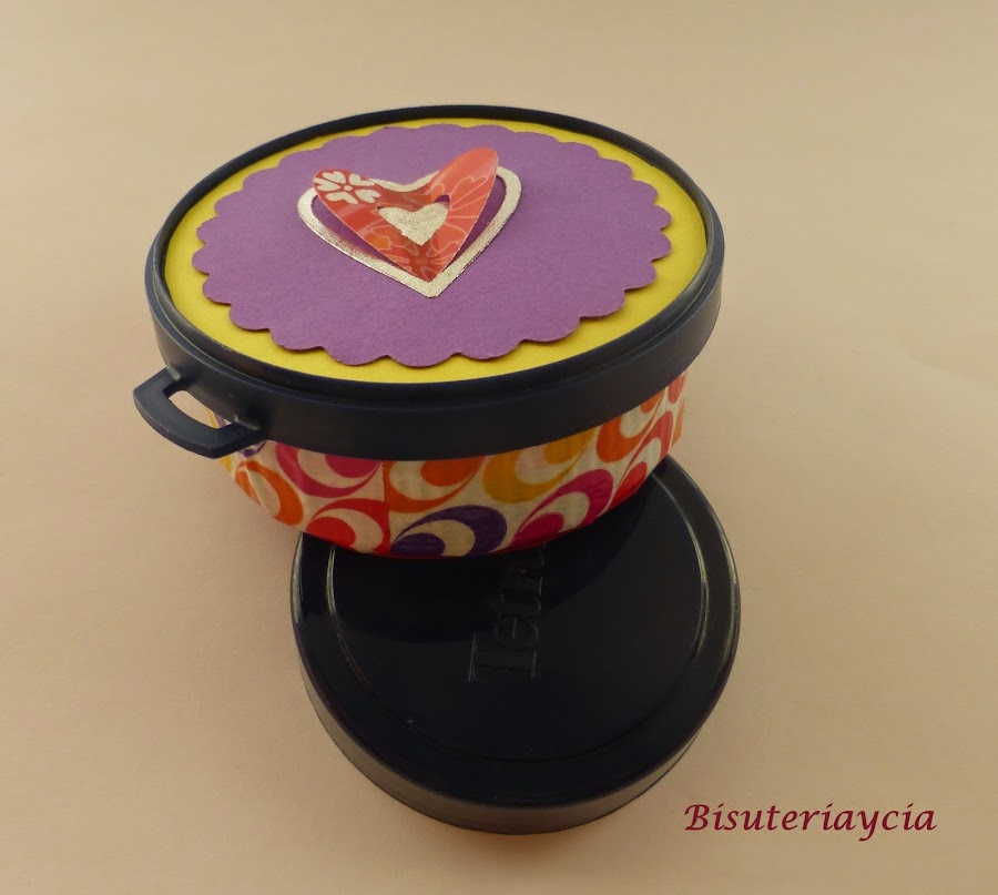 Para decorar la tapa simplemente he recortado una cartulina amarilla para el fondo, con una troqueladora circular he cortado otra circunferencia mes pequeña con los bordes recortados y la he decorado con un corazón adhesivo en 3D.