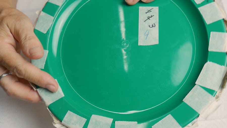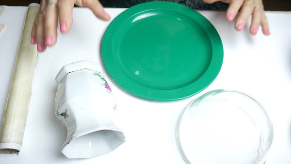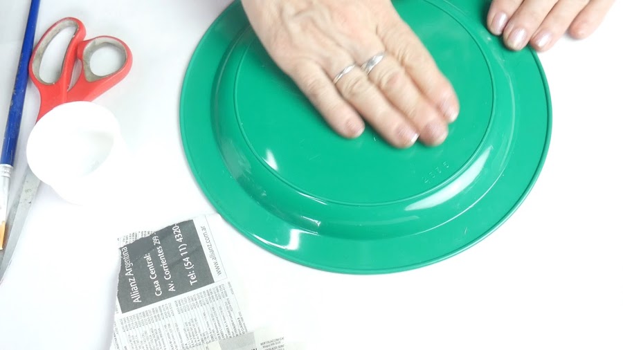 En el caso del plato, no coloque papel fiml adherente pero sí aceite de bebé o cualquier aceite que tengan y luego la aplicación de la primer capa de papel.