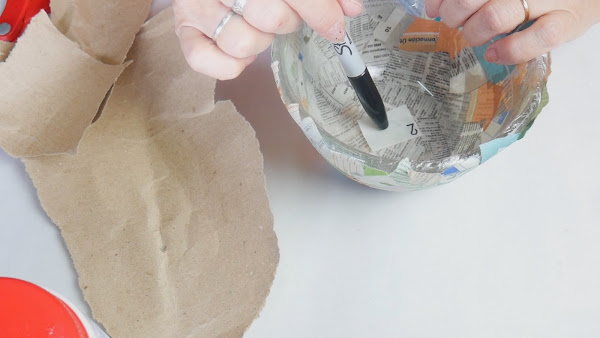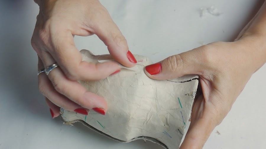y cuando ya está armado le damos la última mano de papel incluyendo esta vez la base y manteniendo las formas obtenidas del molde siempre ayudándonos con la mano.
