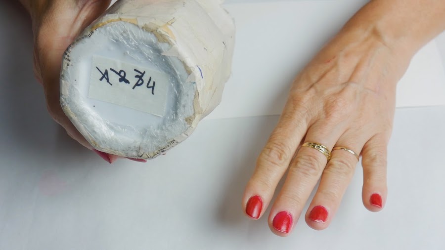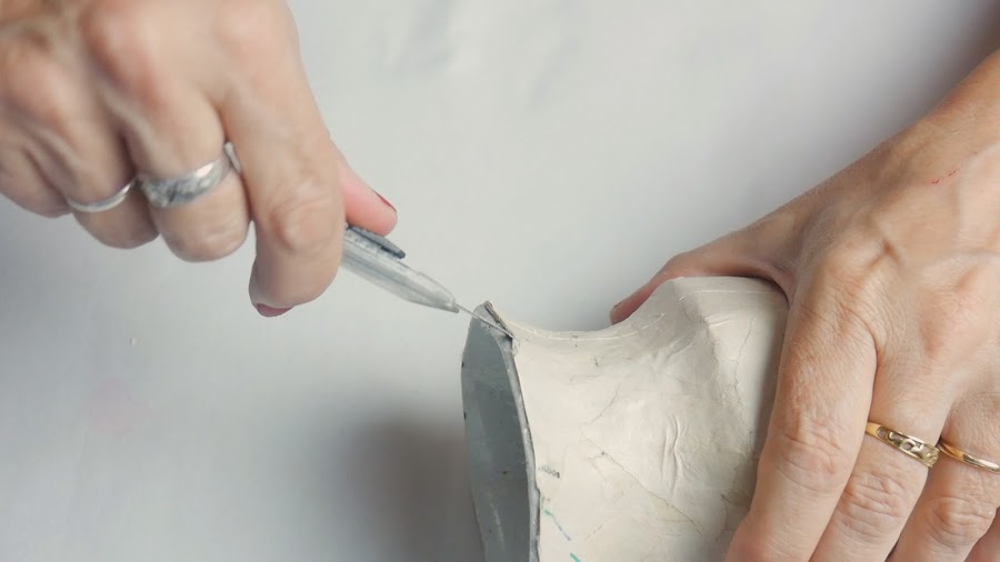 y con un cutter y paciencia corto a lo largo de la marca pasando varias veces por el mismo lugar hasta que se corten todas las capas de papel y voy introduciendo el filo u otro elemento flexible en el medio tratando de despegarlos sin deformar el papel hasta separar todas las partes y quitar el florero de molde.