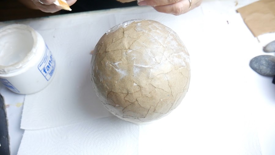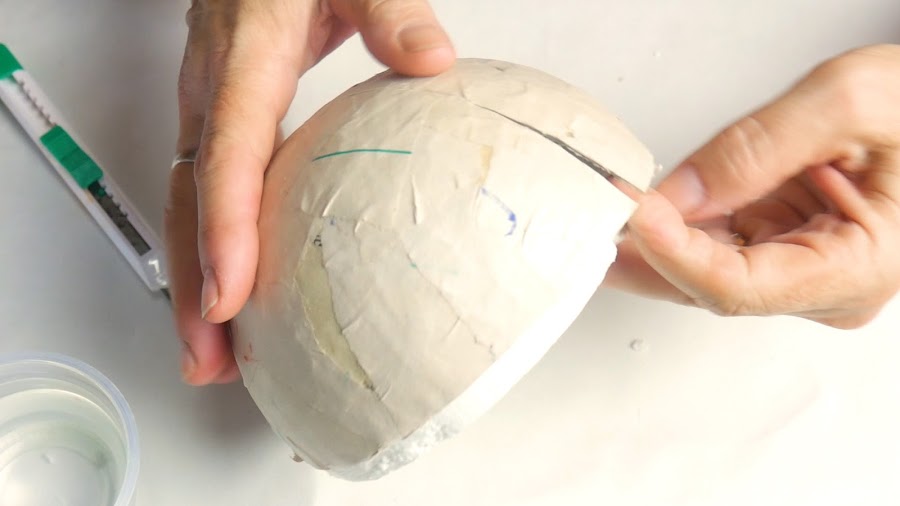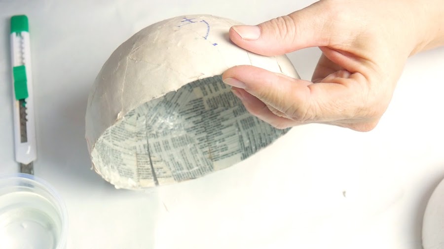 Para la media esfera realizo un corte a lo largo y lo despego igual que el anterior con mucho cuidado de no perder la forma y una vez separadas del molde las uno entre sí para pegarlas primero con cinta de papel y luego cubro con la última mano de cartapesta.