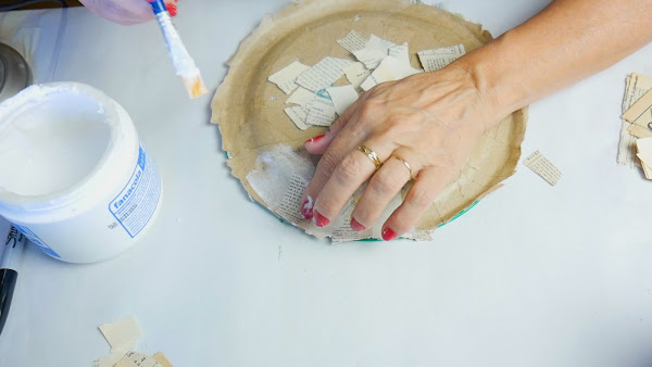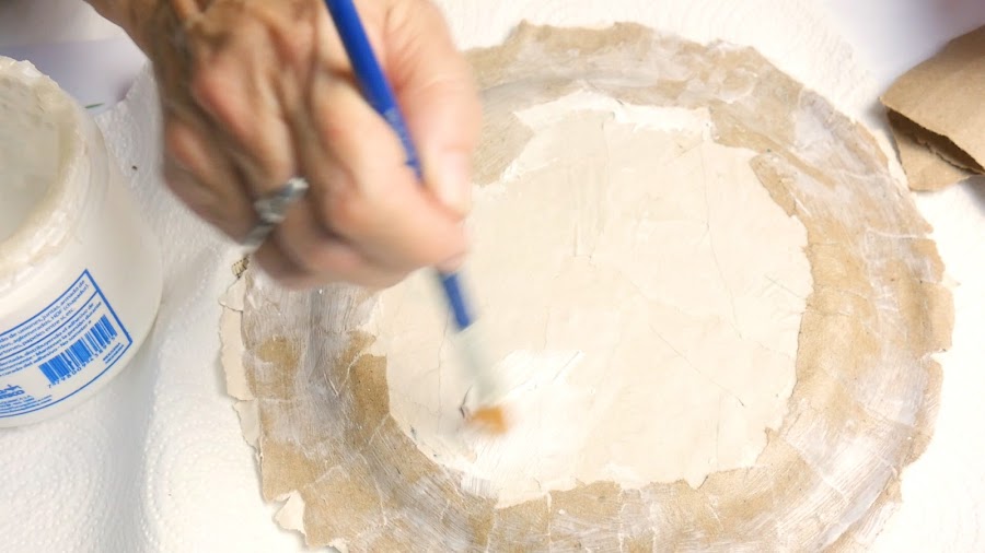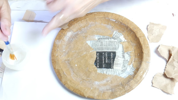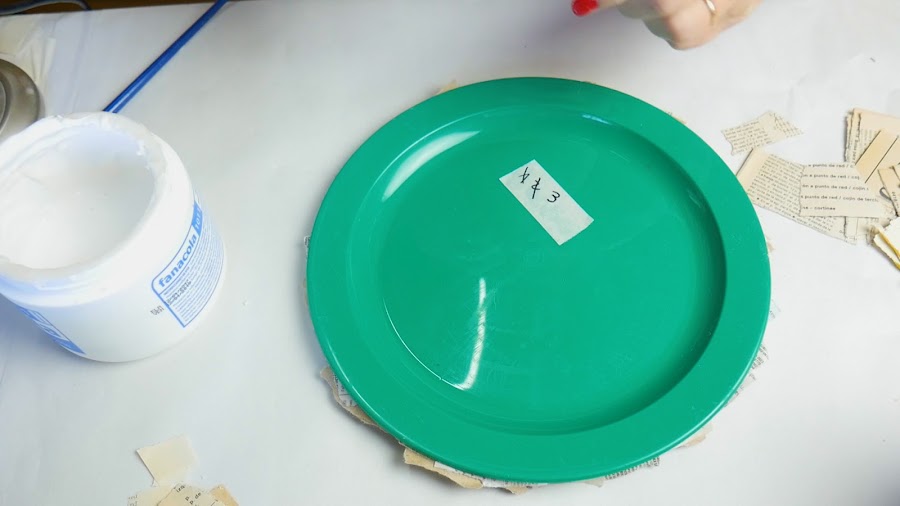 Al plato lo sujeté antes de dar la cuarta capa lo sujeté por los bordes con cinta de papel porque había comenzado a curvarse. Luego sobre las cintas realicé otra mano de cartapesta, lo desmolde e hice cartapesta del otro lado.