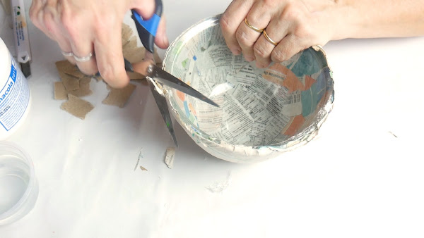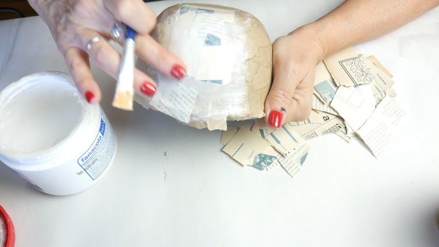 Cuando realizamos cartapesta sobre objetos pequeños o que poseen muchas curvas o sean irregulares necesitamos usar papel en pequeños trozos para poder copiar bien la forma y que no se formen pliegues. La base de éste florero no la cubro con papel ya que me va a dificultar mucho cuando tenga que separarlo.