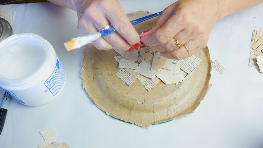 Se pincela con el pegamento la superficie y se van aplicando los trocitos de papel encimándolos entre sí.