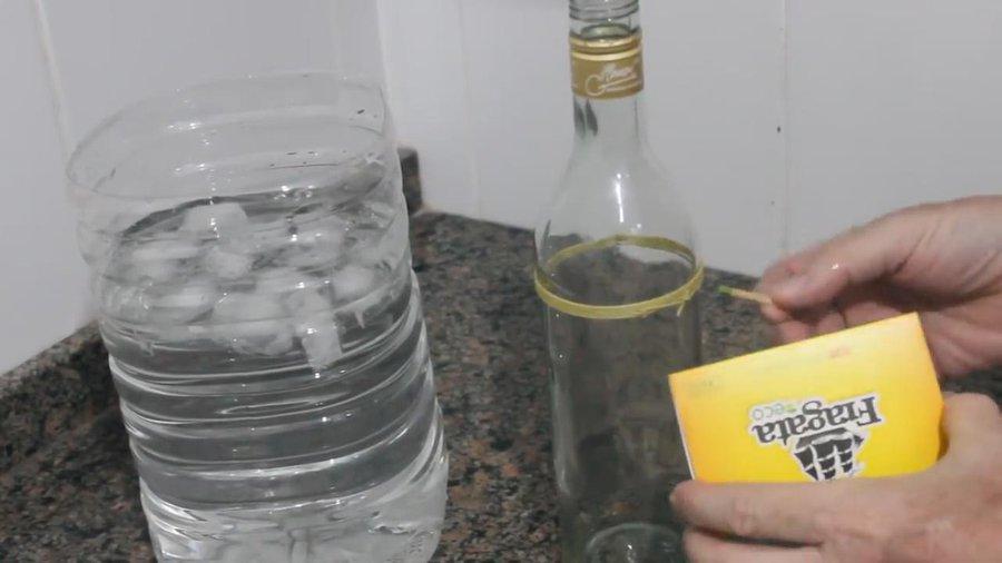 Ahora con un fósforo encenderás el hilo mojado con alcohol. ES MUY IMPORTANTE QUE LA BOTELLA ESTÉ DESTAPADA PARA QUE NO SE ACUMULE EL CALOR DENTRO Y ESTALLE.