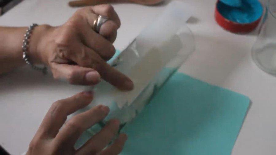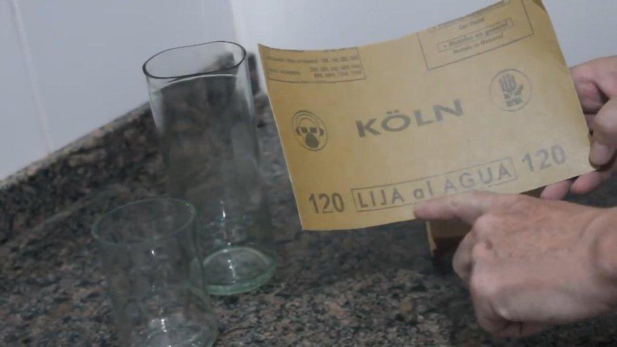 Antes de comenzar a pasar la lija por el filo tienes que humedecerla, para eso puedes utilizar el mismo recipiente con agua en el que habías sumergido la botella. Irás pasando la lija por el borde y humedeciéndola de forma alternada…