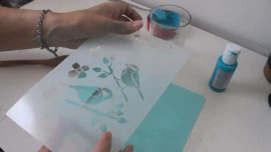 Luego con una esponja o aplicador comenzarás a hacer el estarcido (es el nombre que recibe la técnica de aplicación de la pintura sobre un stencil). Es muy importante descargar la pintura antes de cada aplicación para que no se filtre por debajo del stencil.