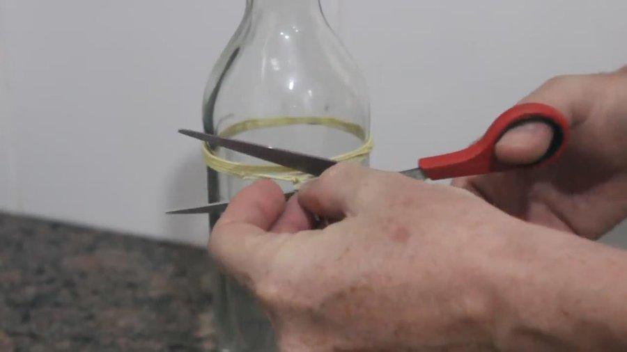 Antes de comenzar asegúrate de que la botella que vayas a cortar esté limpia. Lo primero que tienes que hacer es atarle un hilo de algodón (como los que se usan para atar las cajas de pizzas) a la altura que desees hacer el corte. Ten en cuenta que el corte se producirá un centímetro aproximadamente más arriba de donde enrollaste el hilo. Le darás la primera vuelta y le harás un nudo bien fuerte…