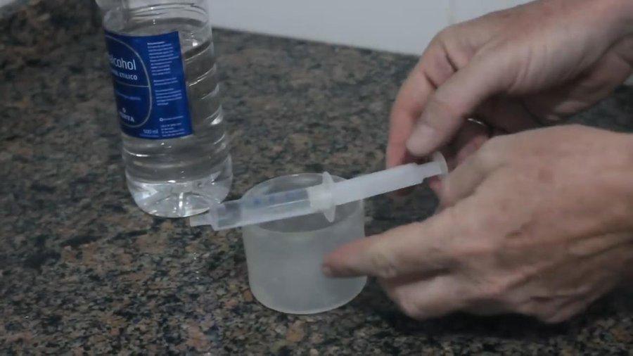Ahora vas a necesitar alcohol etílico que es el mismo que tenemos en el botiquín de casa para curar las heridas, un recipiente donde colocarlo y una jeringa descartable…