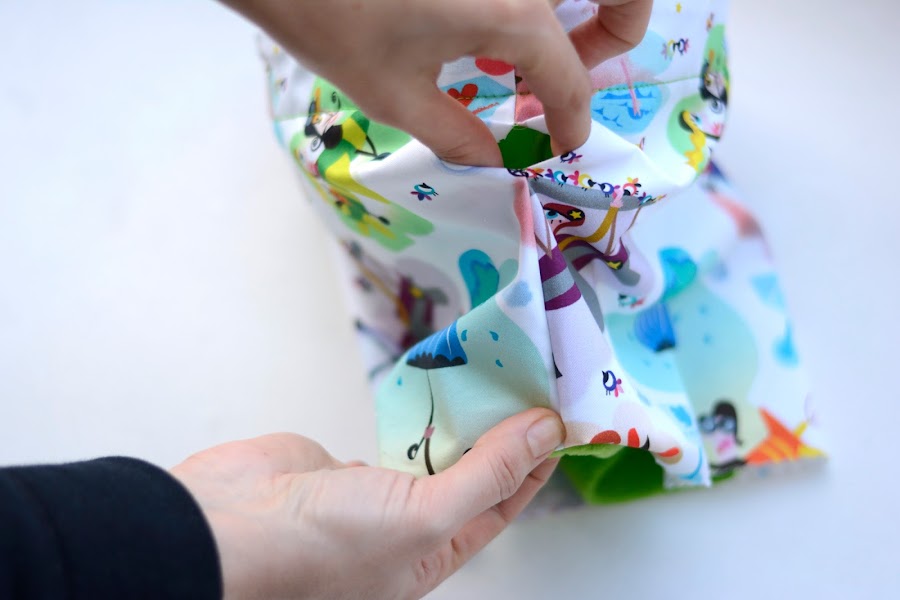 Abrimos la abertura lateral que habíamos dejado y por ahí sacamos las telas que hemos doblado.