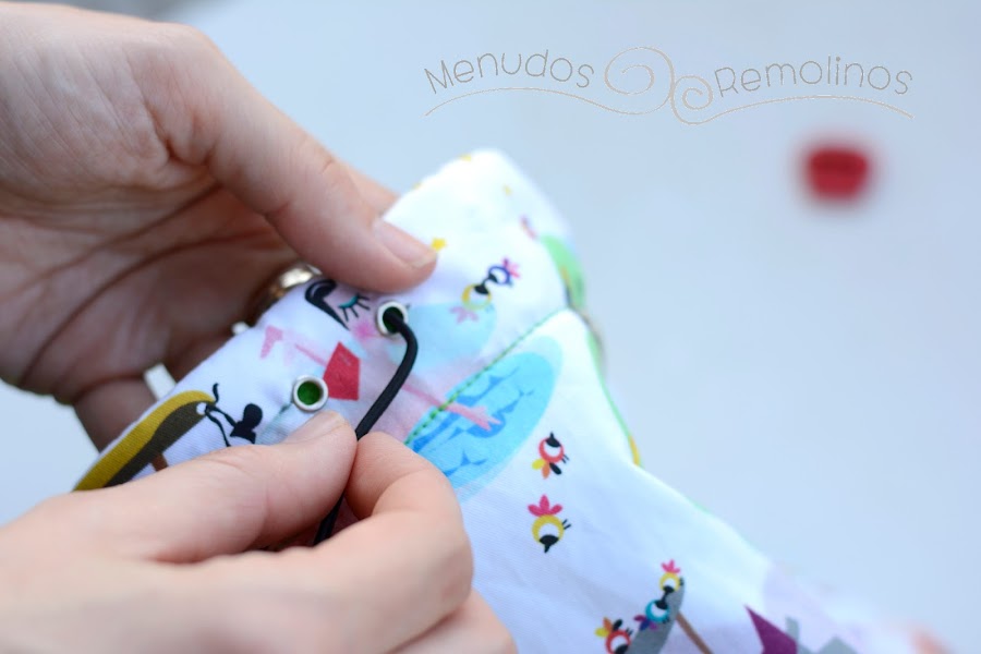Por último meteremos la goma por los ojetes y la pasaremos después por el tope de cordón. Coseremos los extremos de la goma, cortaremos el sobrante y meteremos la parte cosida por uno de los ojetes.