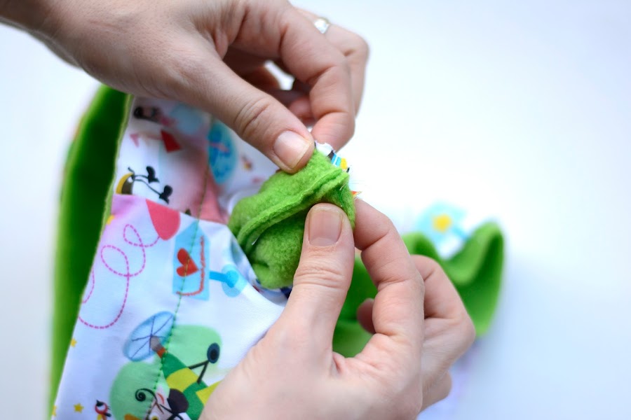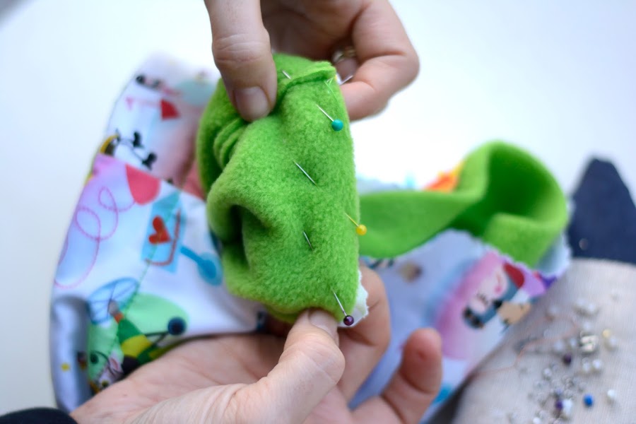 Damos la vuelta a la tela polar y enfrentamos ambas caras. Unimos con alfileres y cosemos todo el contorno.