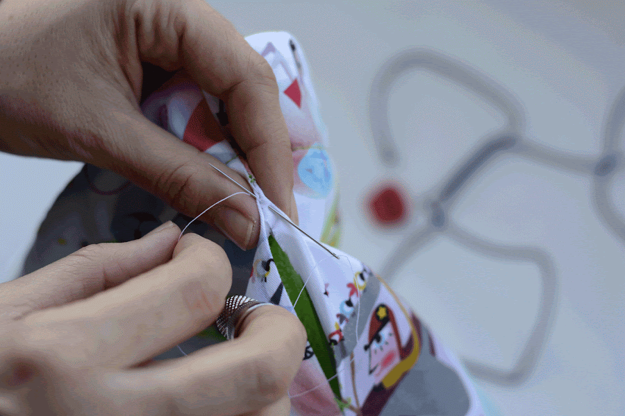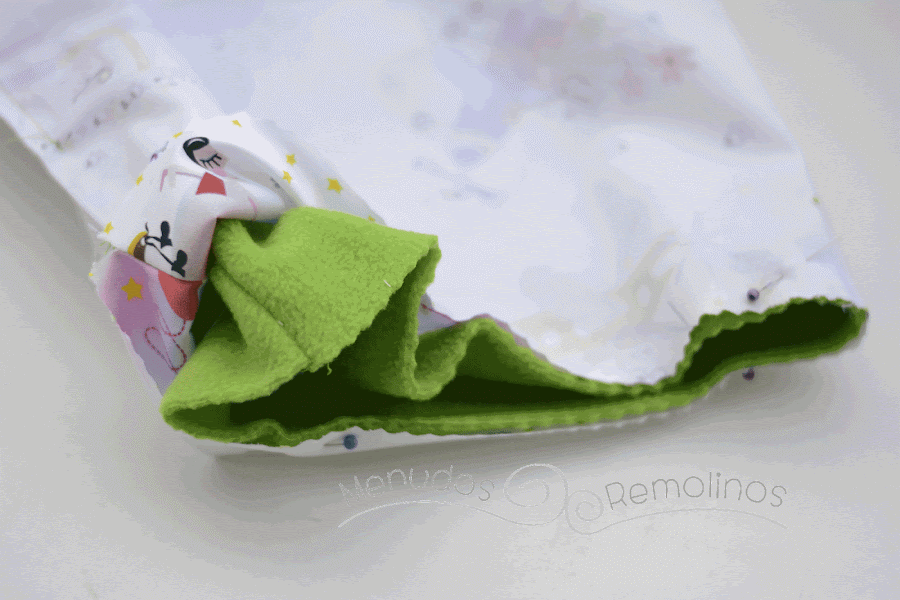 Las doblamos cara contra cara y cosemos el lateral entero de la tela polar y en la tela estampada dejamos una abertura en la mitad