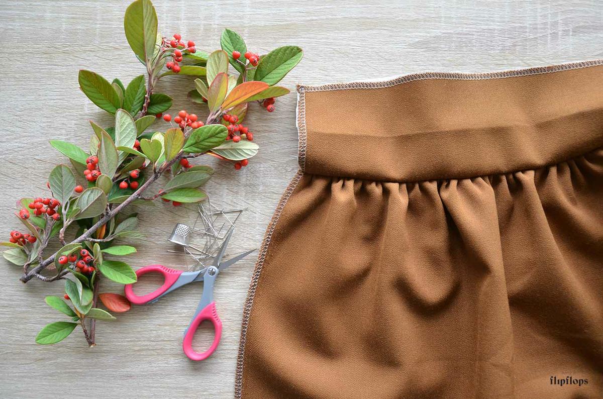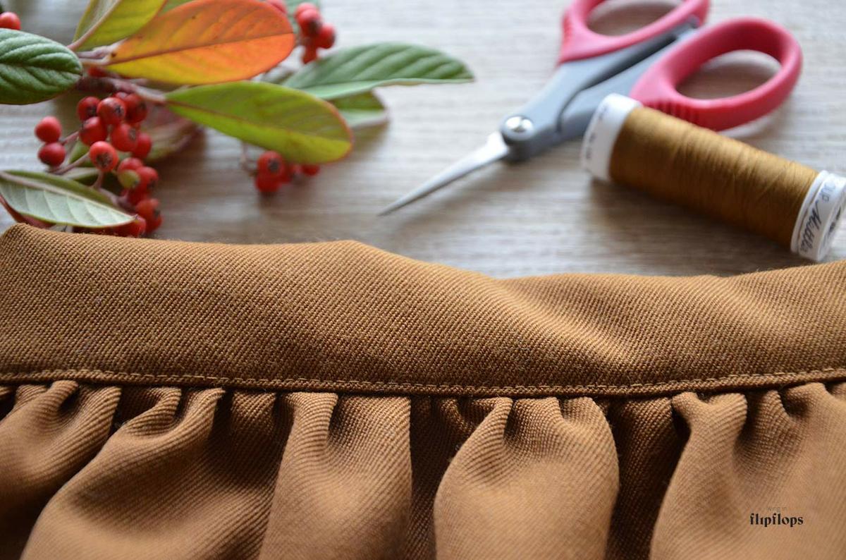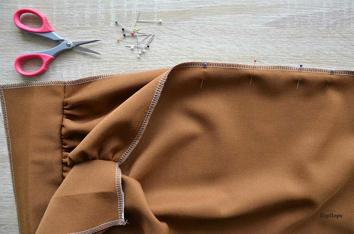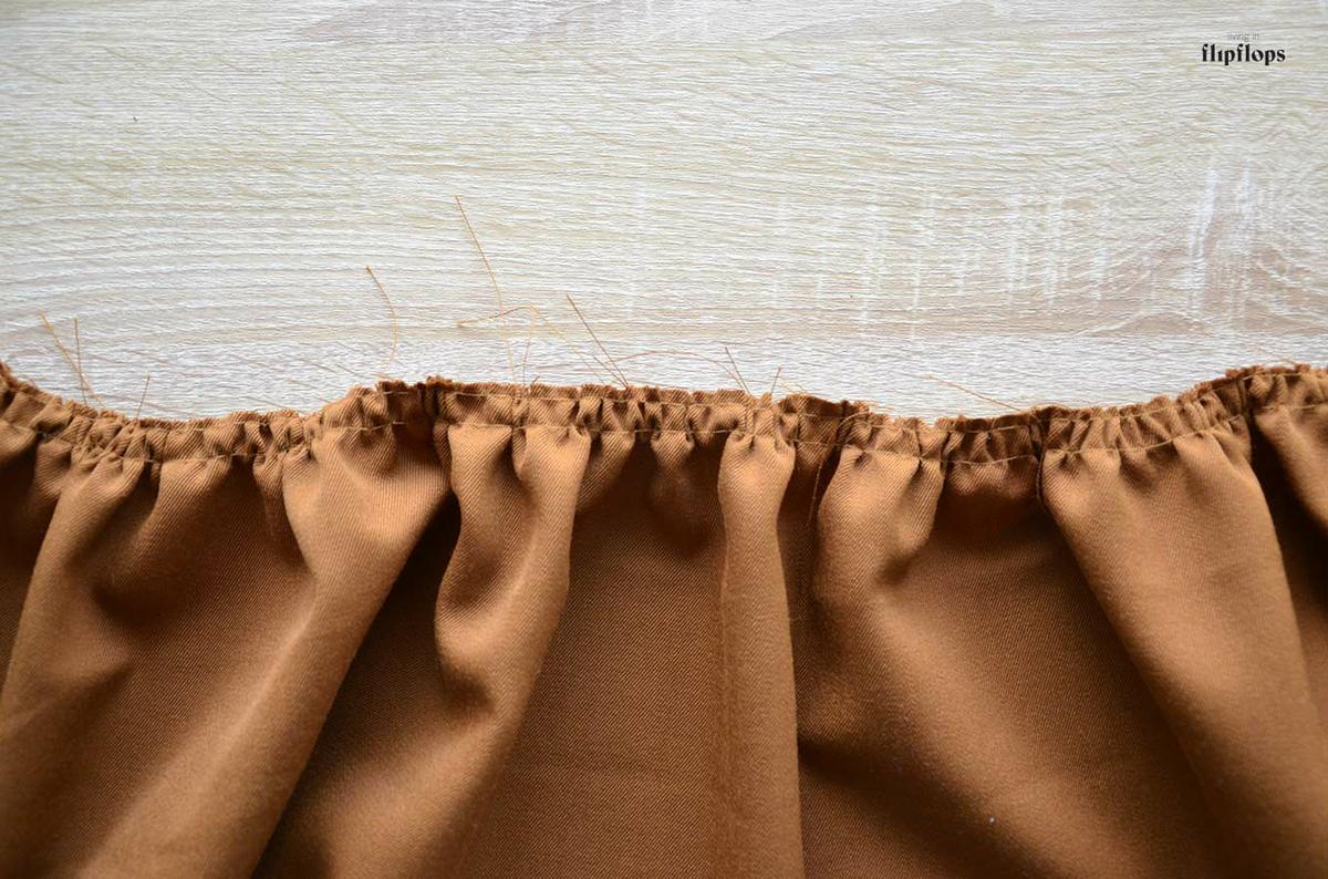 Frunce hasta que alcances la medida de la cinturilla. Intenta repartir los frunces para que el resultado sea lo más uniforme posible.