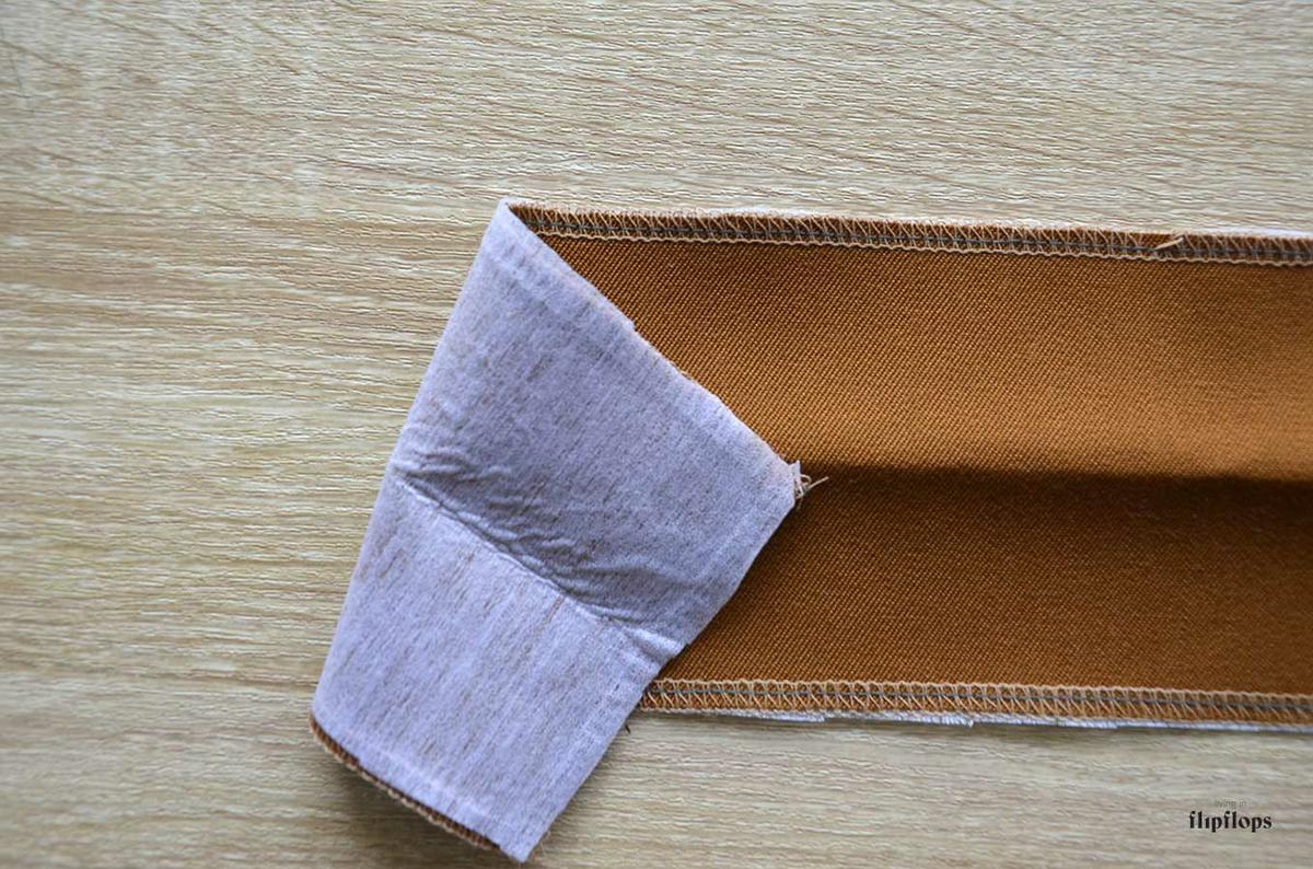 5- Fija la entretela a la cinturilla ( si no sabes como entretelar aquí te dejo este post donde te cuento todos los secretos de la entretela adhesiva ) , pasa la remalladora por los 4 lados y si no tienes pasa un punto zigzag a los bordes, dobla la cinturilla a la mitad.