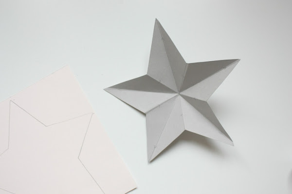 Para las estrellas seguí un tutorial que encontré en el libro de Proyectos en Papel del que os hablé hace tiempo en este post. Se recorta la estrella en cartulina, de doblan todas las esquinas por la mitad con la estrella boca abajo. Después se da la vuelta a la cartulina y se doblan hacia el interior los lados cortos. Por último haz un agujero y coloca un cordón para poder colgarla.