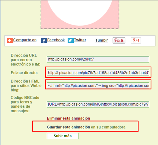 Podemos guardar directamente a nuestro ordenador que es lo mas recomendable para después subir a nuestro blog como un gadget de imagen o copiar lo que sale en el apartado el HTML que la pagina ha automáticamente generado o copiamos el enlce directo.