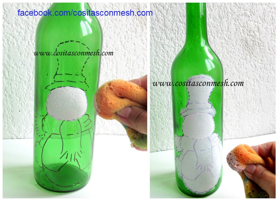 3.-Luego de pasar todo el molde del muñeco de nieve sobre la botella, procedemos a pintarlo. Usa una esponja y pintura acrilica blanca, (ponceamos en todo el dibujo navideño), y dejamos secar muy bien. para proseguir con el siguiente paso. (recuerda que puedes acelerar el secado con una secadora de cabello).