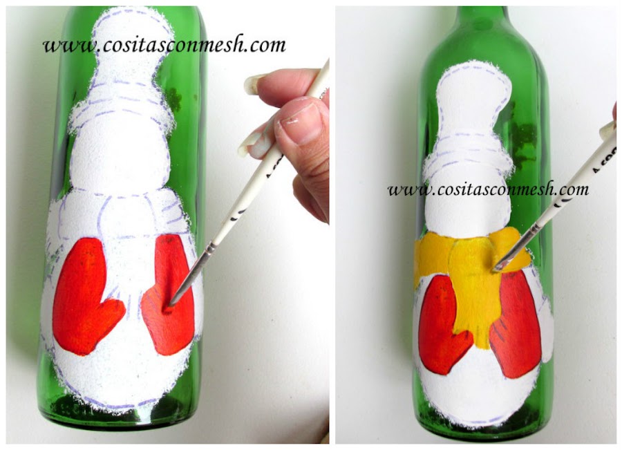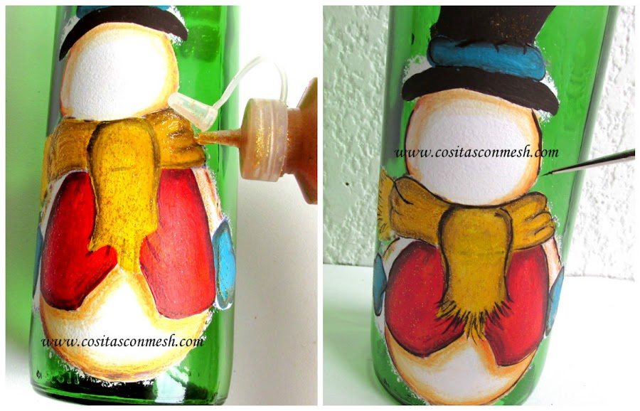Pinta los ojos de negro usando el pincel linner, de igual manera pinta de naranja la nariz, con la pintura de relieve color blanco, pinta toda la base de la botella, asi daremos la apariencia de nieve.