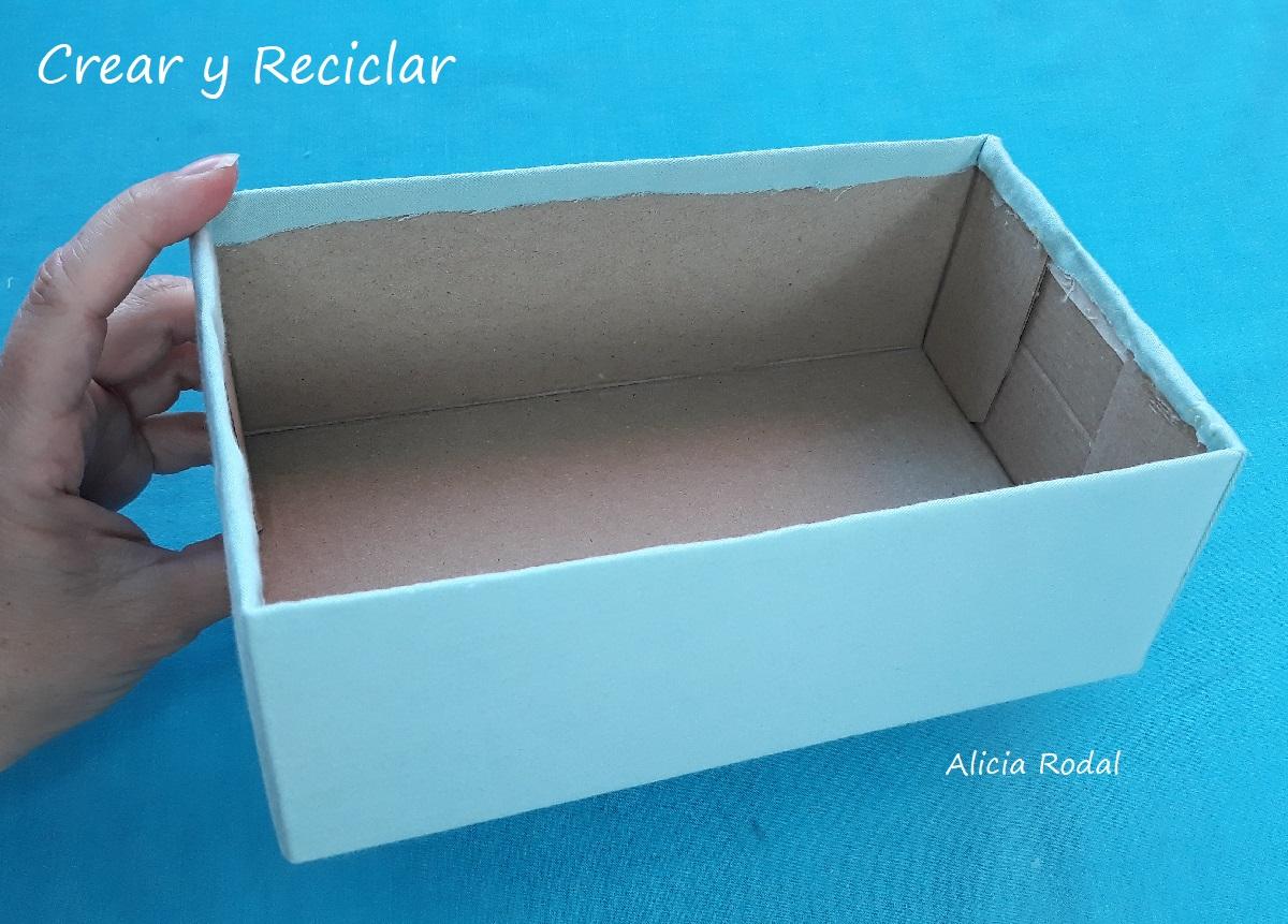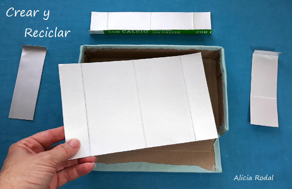 Luego para forrar la caja por dentro voy a reutilizar una caja o envase de leche, tetrabrik, por la parte plateada. De esta manera le damos un bonito acabado.