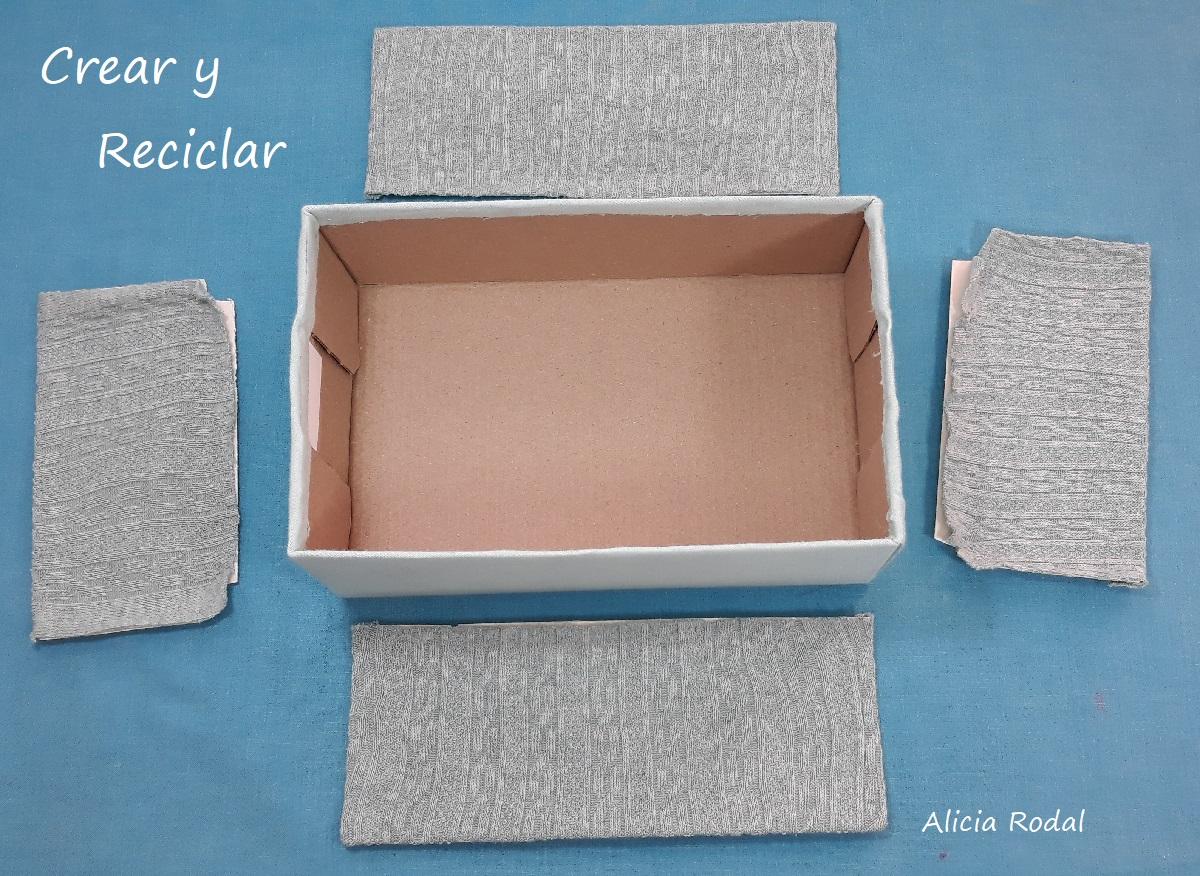 Para forrar estas piezas voy a reutilizar diferentes materiales, tanto por dentro como por fuera. Empecemos con la tapa.