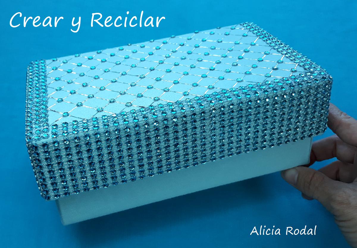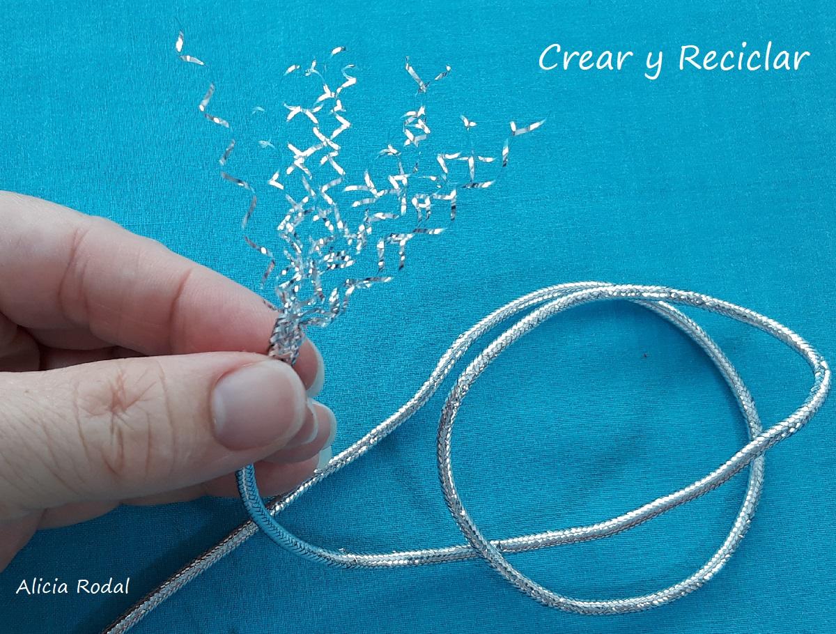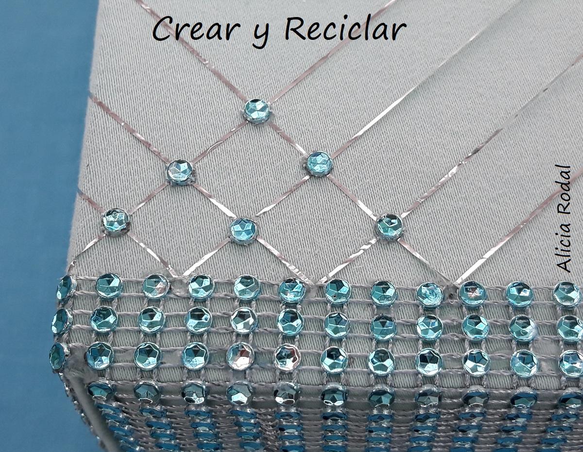 Con estos pequeños detalles vamos a transformar una simple caja de cartón en un organizador de lujo. Compré una tira de brillantes o piedritas (de plástico) en color azul y plata, y voy a reutilizar un trozo de cordón metalizado en color plateado.Al cordón le quitamos la parte interna y deshilachamos cada uno de los hilos de plata por separado. Y la tira de brillantitos los voy a cortar para cubrir la parte de la tapa.