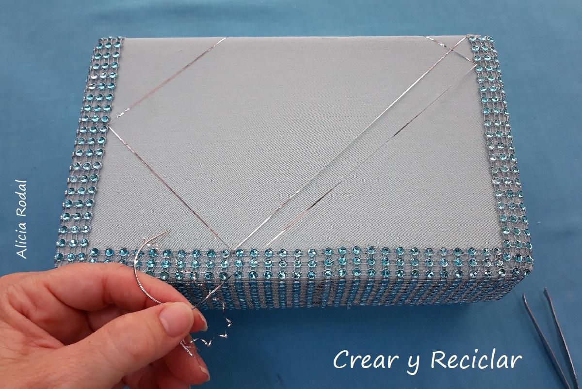 El hilo de plata lo voy a pegar en forma diagonal y cruzada, de manera que se formen unas figuras geométricas en forma de rombo. Con ayuda de una aguja curva, con a pasar el hilo de plata por el borde de la tira de brillantes, aprovechando ese hilo que tienen. Si tu prefieres, tan sólo los puedes pegar.