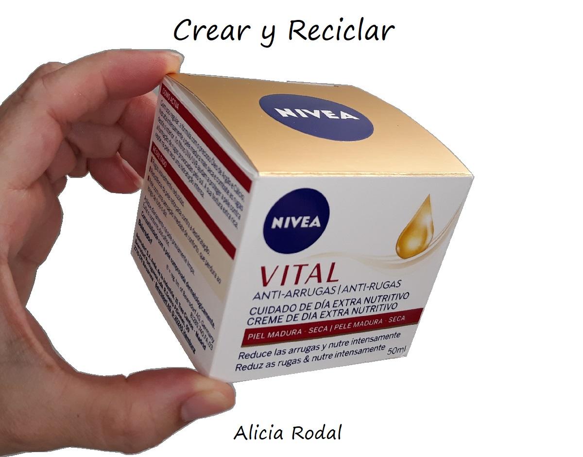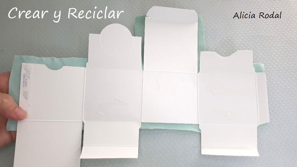 Esta segunda idea la hice con una caja de cartón cuadrada de una crema facial.Lo primero que voy a hacer es desarmar la caja, cortando la pestaña por la que está pegada, con mucho cuidado para que no se rompa.