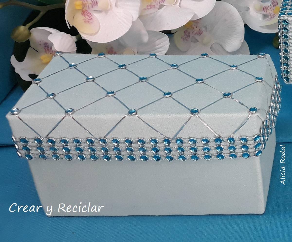 Para decorar la caja usaré la misma cinta con los brillantes plateados y azules, y el mismo hilo metalizado o hilo de plata, pero de una forma diferente, para que sea el mismo estilo, pero un diseño distinto.