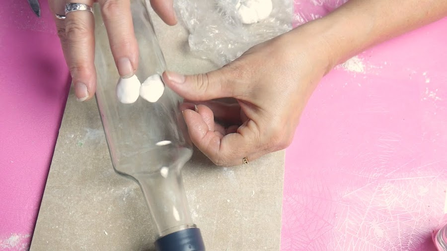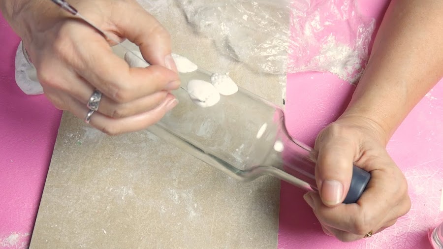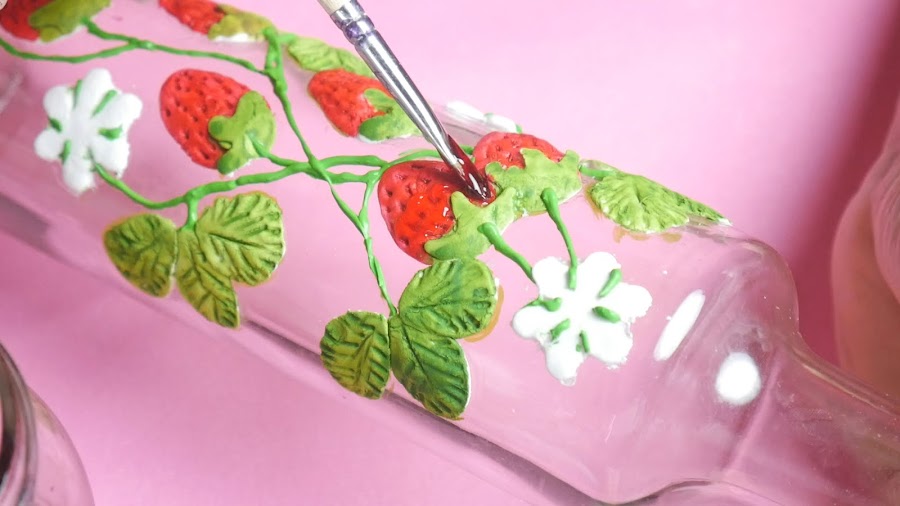 Para la otra botella voy a hacer unas frutillas o fresas, para ello hago unas bolitas que le doy forma sobre la botella.