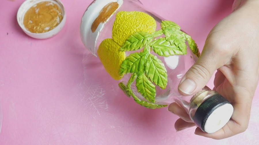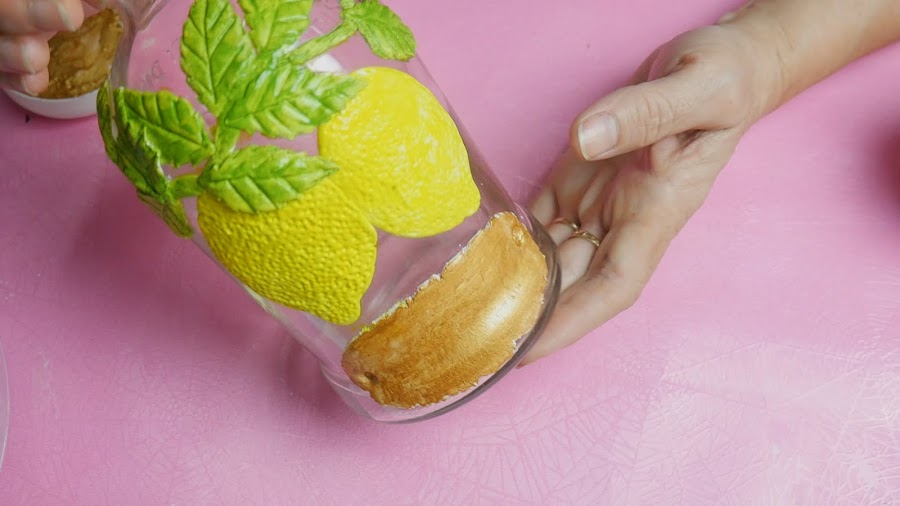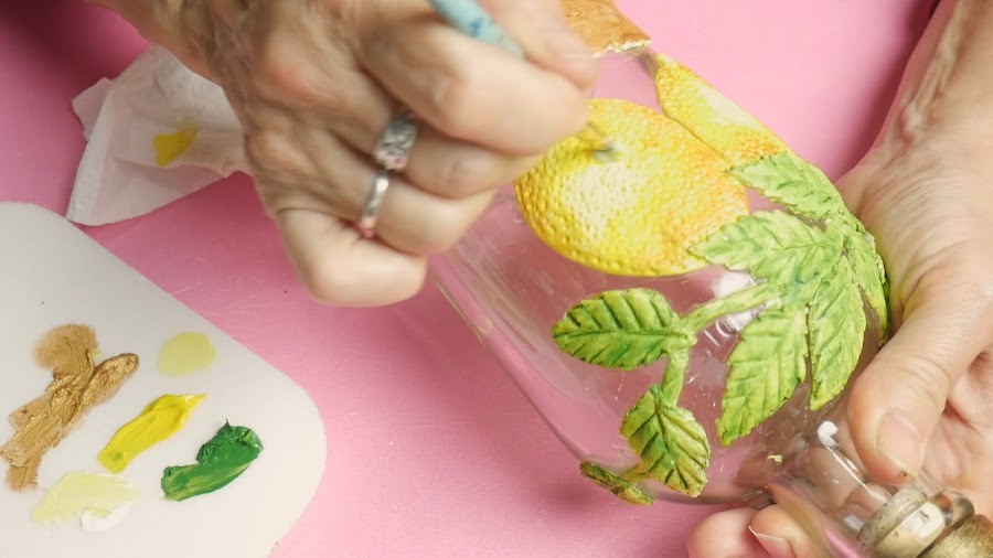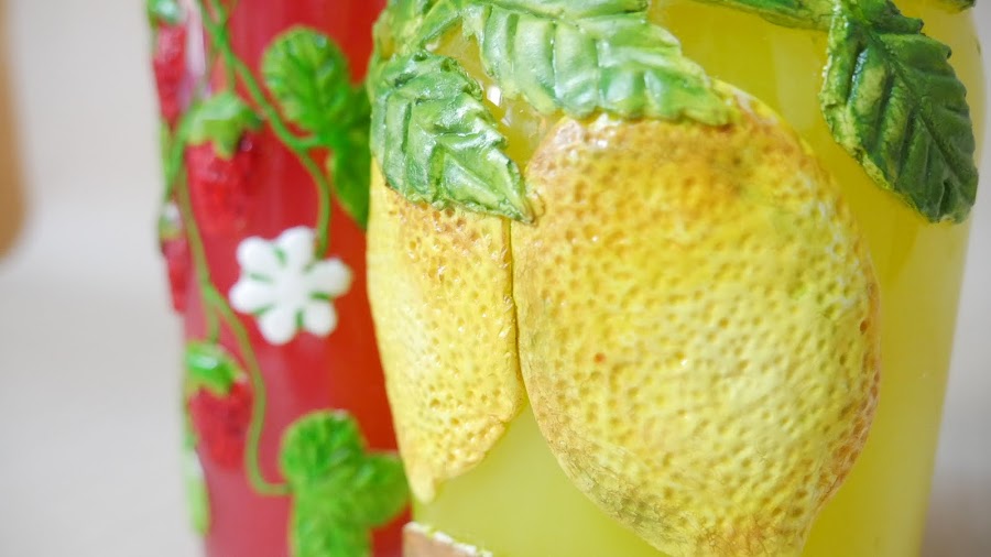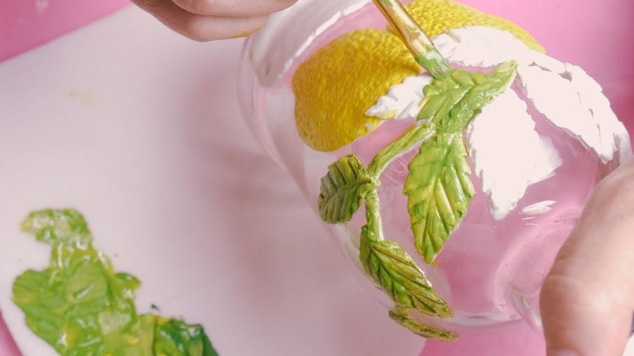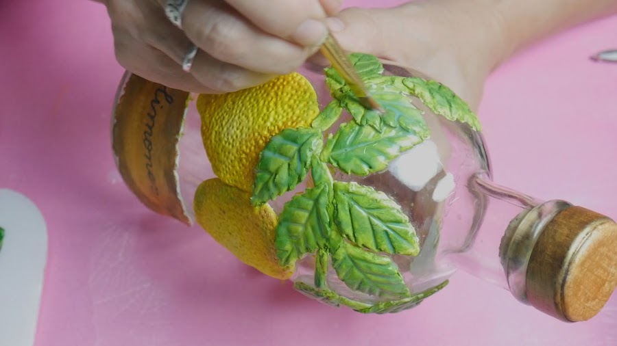 Tomé una porción de la masa, le fui dando forma ovalada y la fui agrandando y aplastando en mis manos para hacer los limones y cuando tuvo el tamaño deseado lo apliqué directamente sobre la botella en el lugar elegido. No les coloqué pegamento ya que la masa estaba muy elástica y estando así queda adherida con el pegamento que ya contiene en su fórmula que es la cola vinílica y la silicona.