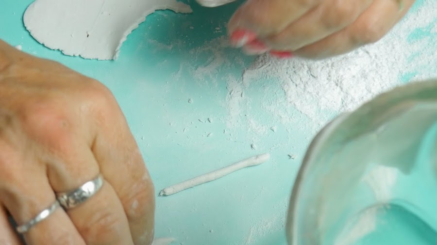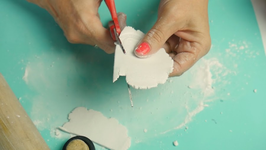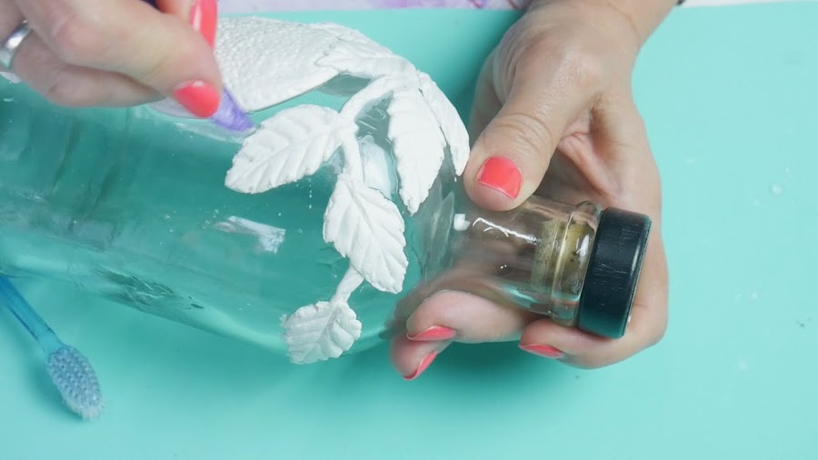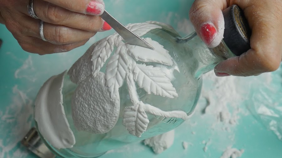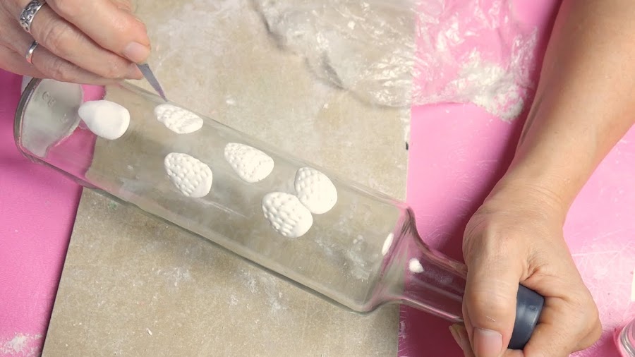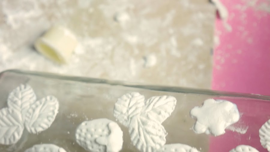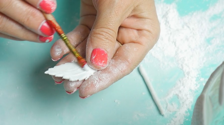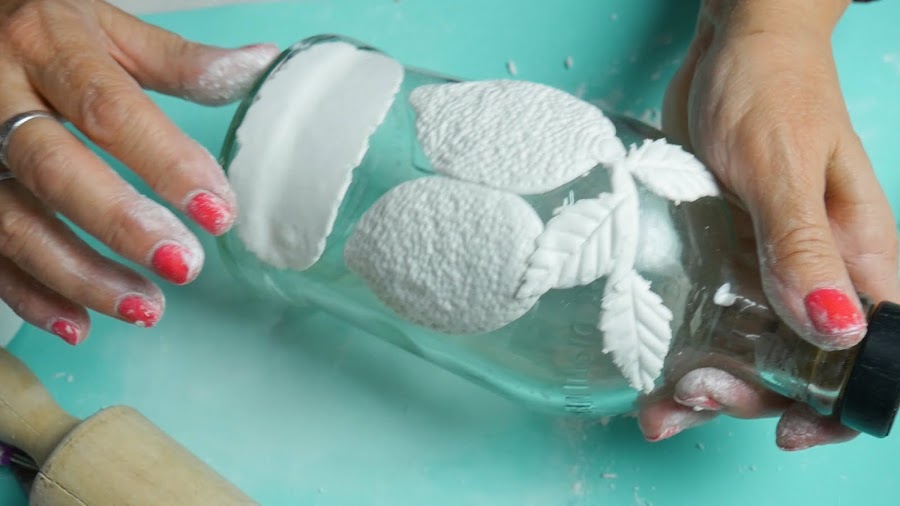 Para hacer las hojas, estiro la masa con un palote o puedo hacerlo con la mano y con un cortante de hojas, presiono y separo la pieza, le coloco pegamento porque al ser mas finita y colocarle más talco para estirarla comienza a secarse y así la pego en la botella.