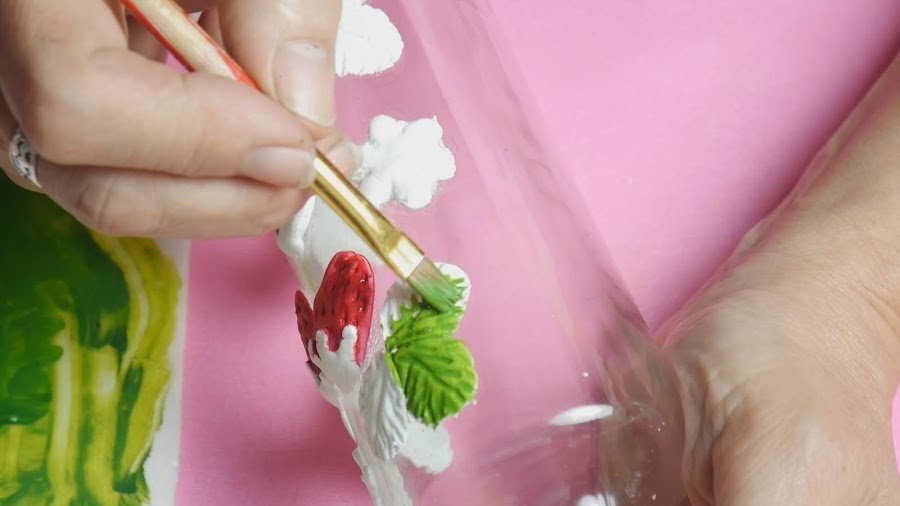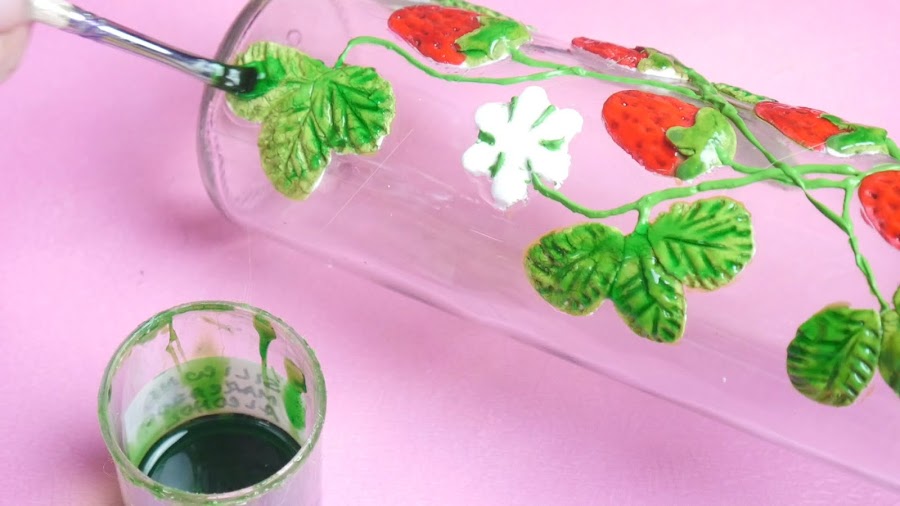 Luego en lugar de barniz al agua pinte con lacas vitrales, en este caso use las lacas hechas con pegamento de silicona, rojo a las fresas y verde a las hojas, link: