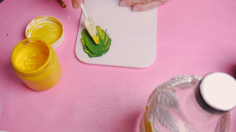 Luego mezclo un poco de acrílico verde con amarillo para pintar las hojas y los tallos.