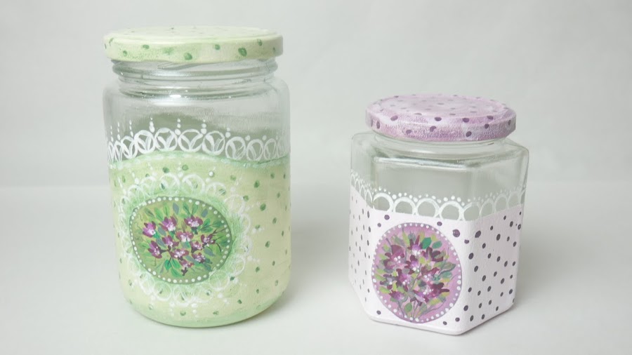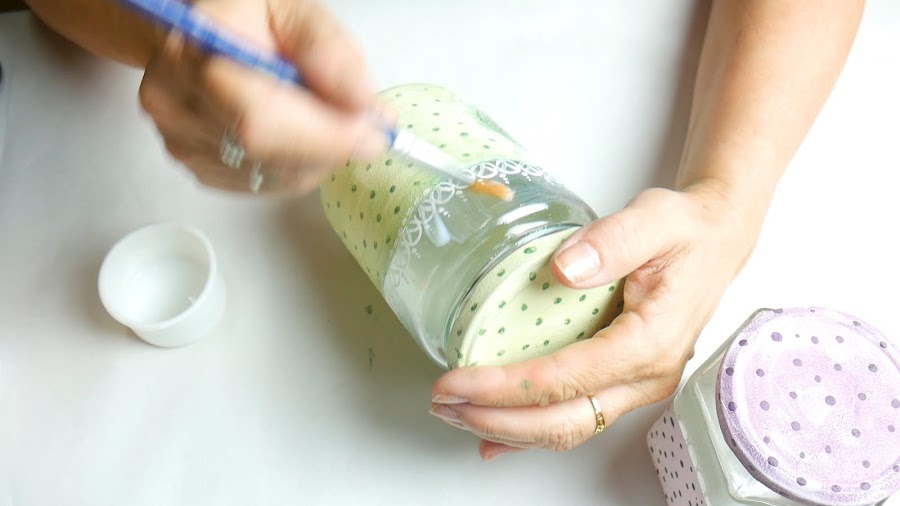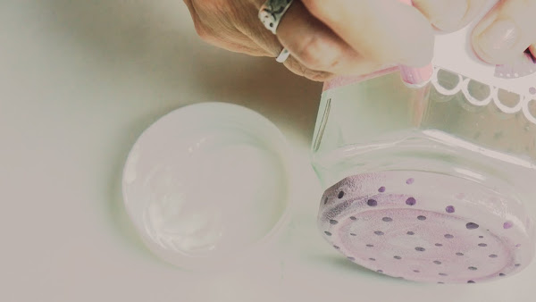 Para hacer las puntillas utilicé un capuchón de una fibra y la misma pintura acrílica con el barniz que había usado en los frascos. Mojaba la punta del capuchón cada vez y la aplicaba sobre el borde que no tenía pintura