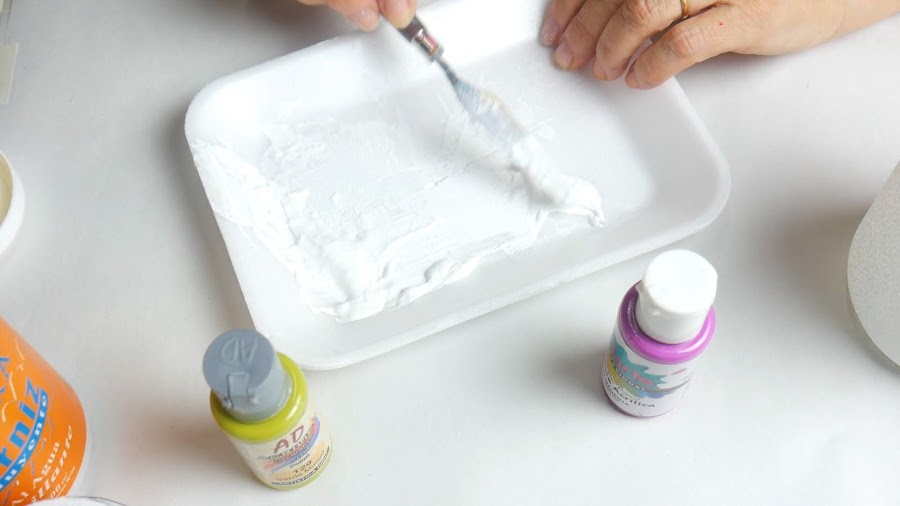 con color, a la mezcla de pintura anterior que me quedo la dividí en dos y la coloree con verde musgo a una de ellas y a la otro con magenta