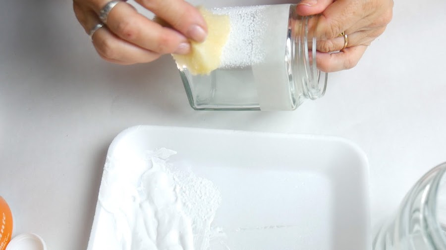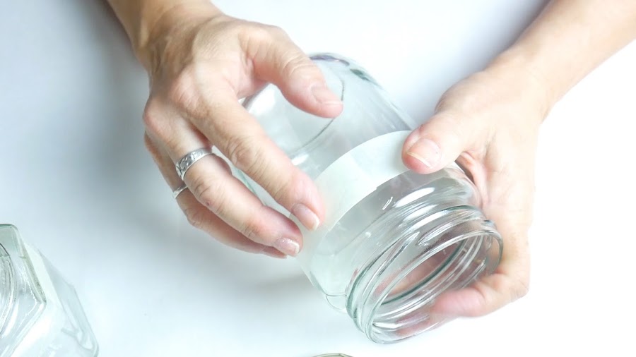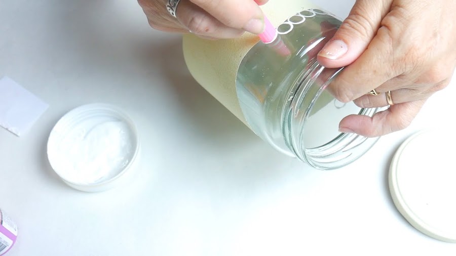 Mezclé éstos dos componentes y los apliqué sobre el frasco, en la zona que había elegido, debajo de la cinta.