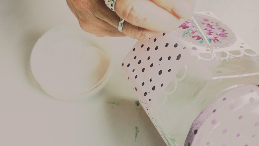 Para el otro frasco, como quiero solo medio círculo del capuchón coloco un papel para que se marque solo la parte de arriba, también le realizo los puntitos alrededor de las ondas.