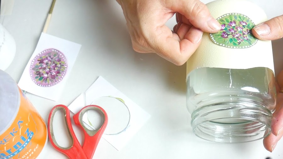 Recorté cada uno de las figuras y le pege una a cada frasco con cola vinílica.