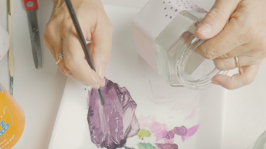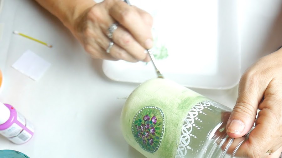 Posteriormente intensifiqué los colores con pinceladas de acrílico con barniz, dando sombras en la parte superior e inferior del frasco para que se destaque la puntilla.
