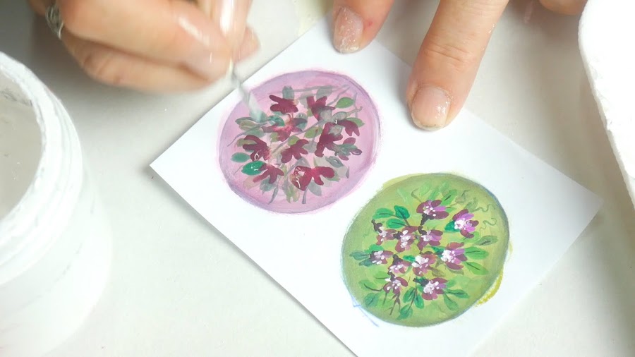 Mientras se secaba la secunda capa de pintura dibujé sobre un papel dos óvalos y los pinté en su interior con los mismos colores con los que pinte cada frasco un poco más intensificado y sobre ellos pinté algunos ramos de flores con sus hojitas y tallos. Como los frascos son distintos uno lo voy a colocar en posición vertical y otro horizontal.