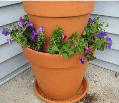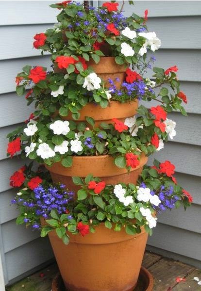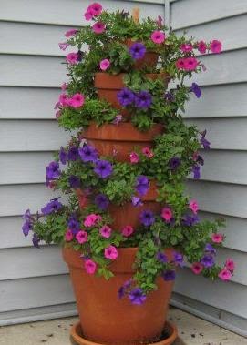 Mira lo lindo que queda esta torre de macetas con flores para decorar la entrada de la casa