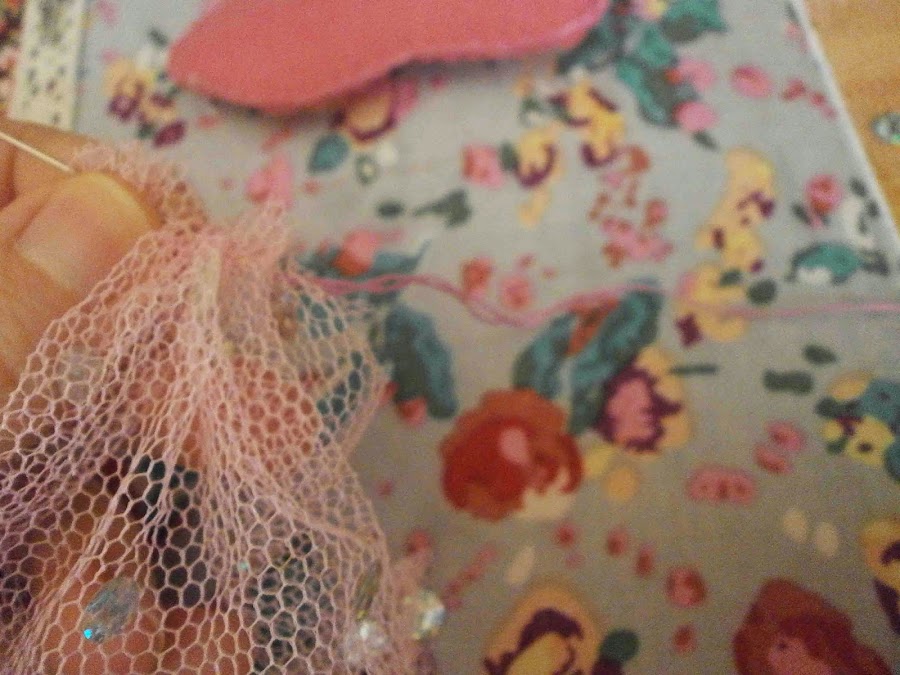 Después con la tela le hice la falda de la bailarina.bailarina. También frunciendo con la aguja y el hilo.Decore con tripa de pollo y los adhesivos de stras para hacer de botones del vestido.