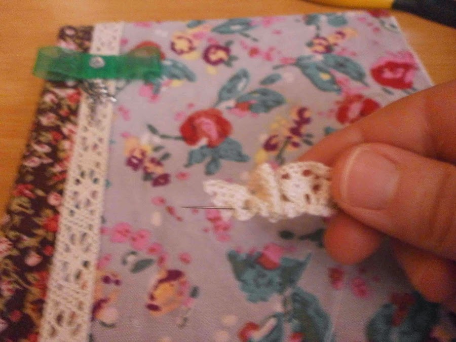 Una vez secas las tapas pegue con silicona entre las dos telas la puntilla, hice lo mismo por la parte de atrás y también por dentro de las tapas.