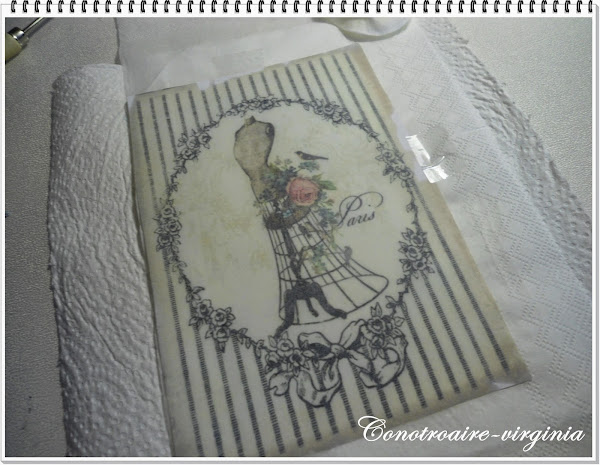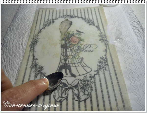 Imprimi la imagen en modo espejo, y coloque la imagen sobre el tissue, (yo utilice una de las capas blancas de las servilletas), y debajo puse papel de cocina.